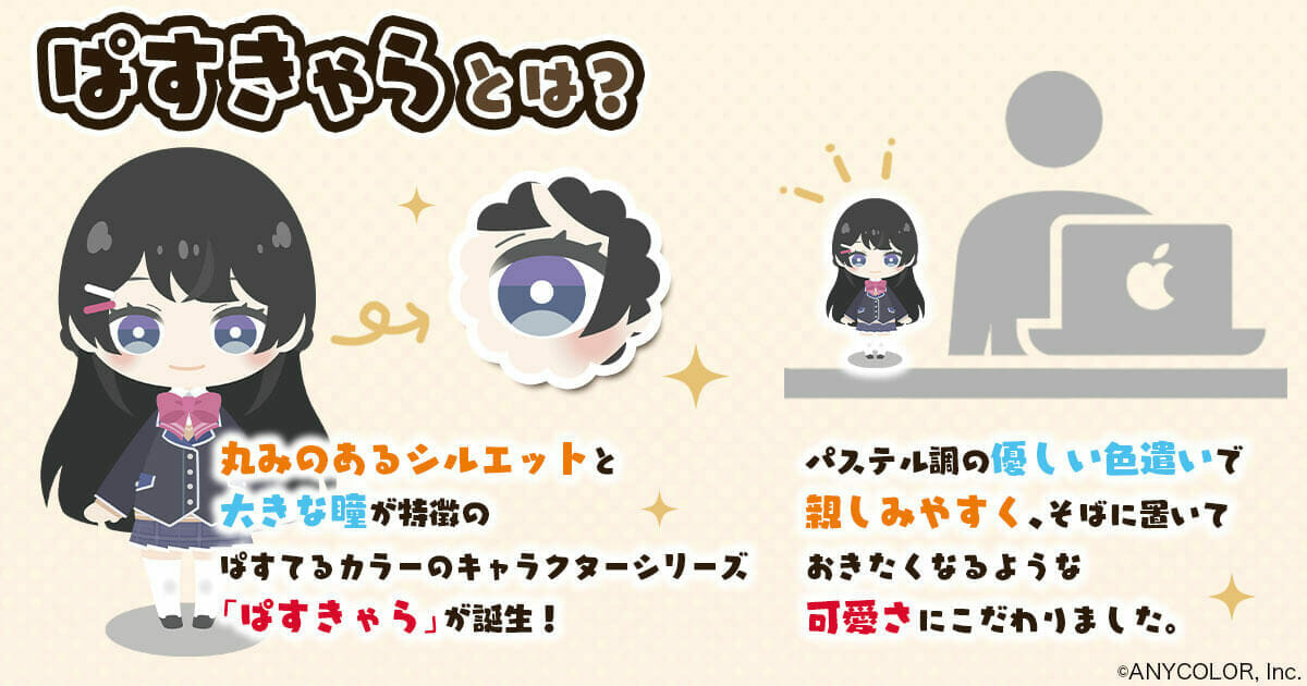 今回、にじさんじが採用されたグッズ『ぱすきゃら』とは、丸みのあるシルエットと大きな瞳が特徴のパステルカラーのキャラクターシリーズだ。パステル調の優しい色遣いで親しみやすく、そばに置いておきたくなるような可愛さにこだわっている。