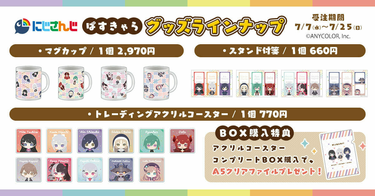 株式会社eStreamが展開するパステルカラーのキャラクターシリーズ『ぱすきゃら』に、VTuberグループ「にじさんじ」の人気ライバー達が登場!VTuber11人のトレーディングアクリルコースター、マグカップ、スタンド付箋が販売される。