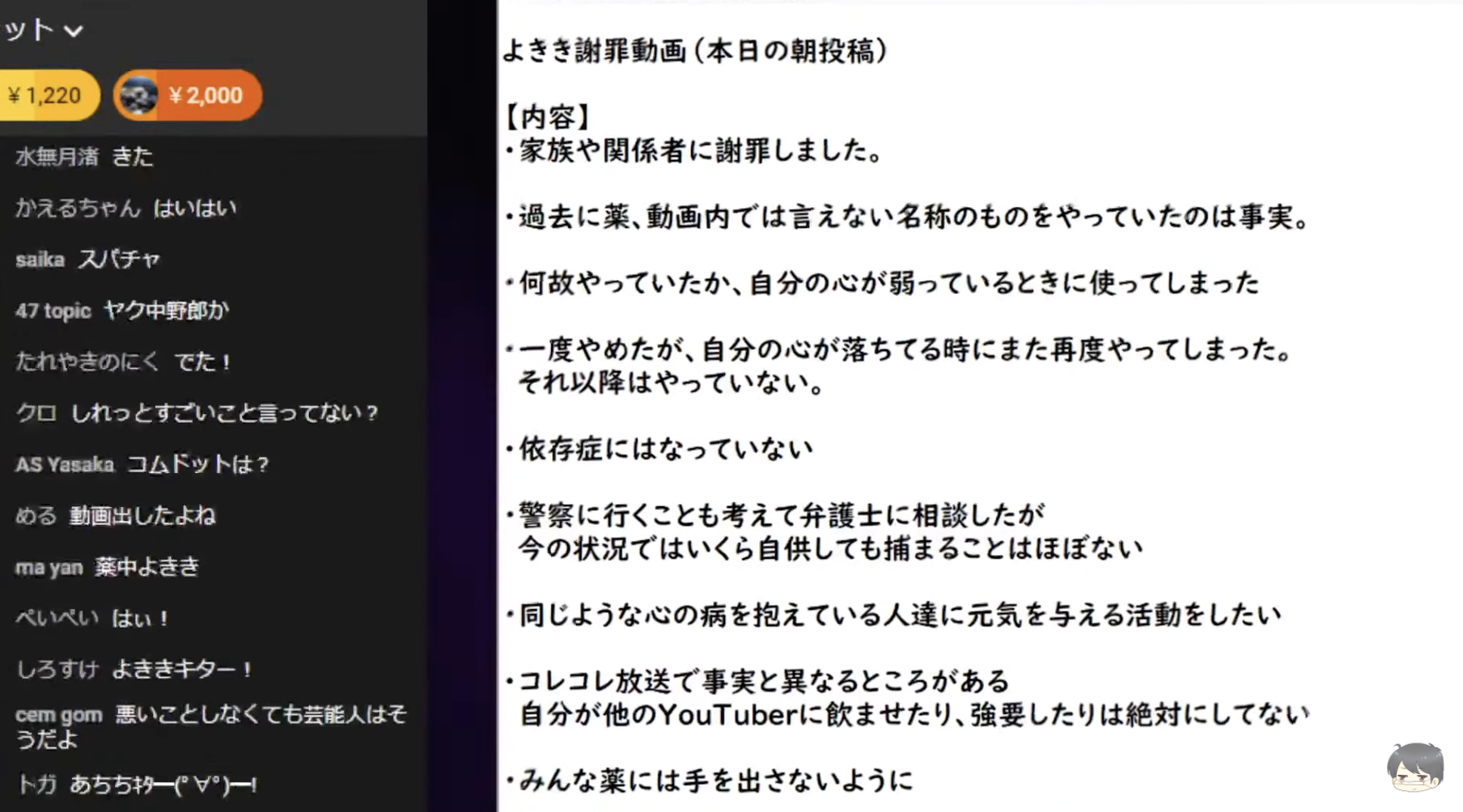 8月30日に「コレコレ」は、薬物の売人を彼氏に持つ女性からタレコミがあったとして、よききの薬物使用疑惑を暴露したのだ。これを受け、よききは9月1日午前2時ごろに「今回の件について」という動画を公開し、薬物使用を認め、謝罪動画を投稿した。
