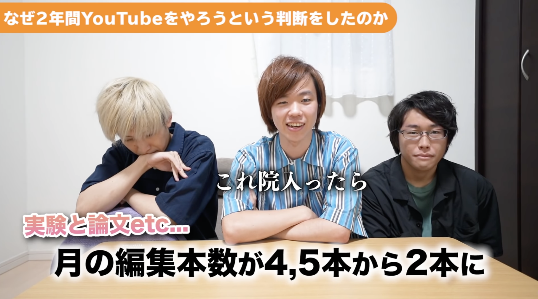 4月から大学での研究活動が本格化し、月にこなす編集本数が4~5本から2本に減ったという。大学院に入ったらYouTubeと勉強が両立できず中途半端な状態になると思い、そうなるよりは、大学院に入るのを辞めてYouTubeに全力で取り組んでみようと思ったそうだ。