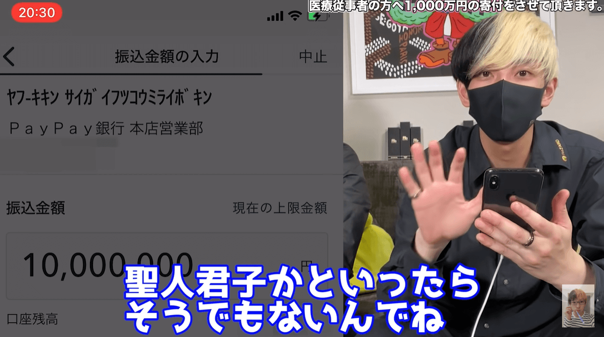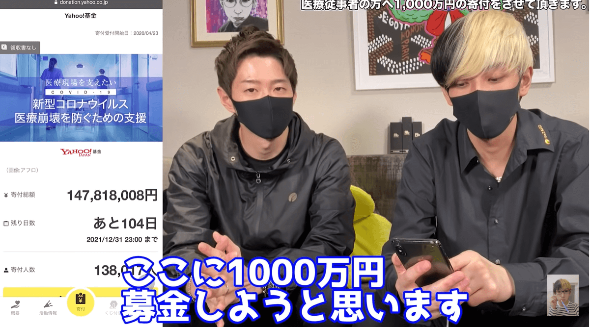 ヒカルが動画「1000万円を寄付しました いま自分にできることを少しでも ヒカル」にて、Yahoo!基金「新型コロナウイルス医療崩壊を防ぐための支援」い1,000万円を募金する様子を公開した。