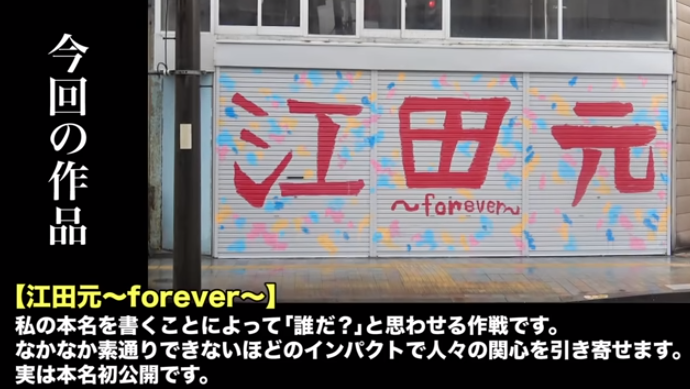 はじめしゃちょーはとあるお店のシャッターにでかでかと自身の本名をペイントし、解説にて「実は本名初公開です」と告白した。