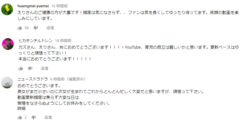 良い動画を投稿するYouTuberには、やはり良いファンが多く付いてくれるのだ。動画のコメント欄にはカズさん、そしてえりさんの体調を気遣った内容のコメントが多く寄せられていた。
