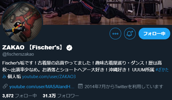 第6位はフィッシャーズのレアキャラであるザカオのアカウント。普段は古着屋の店員の仕事をしていたことからファッションに関するツイート、そして本業のダンスに関するツイートが数多く投稿されている。