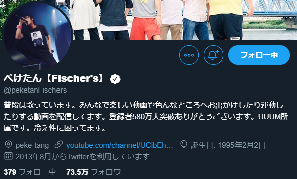 フィッシャーズのメンバーに関するツイート・私生活のツイートなどをつぶやいているが、その中でも愛犬のちゃっぴーの動画や写真のツイートは至高の癒し。ぺけたん・ワンちゃん好きの方は是非。