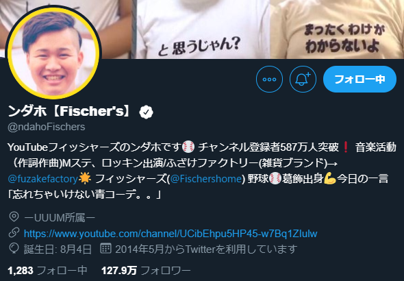 いつもはおバカ担当のンダホだが、Twitterでは意外と真面目な長文ツイートが多く、読み応えたっぷり!フィッシャーズの中では一番写真投稿率が高く、面白さは第一位と言っても過言ではないだろう。