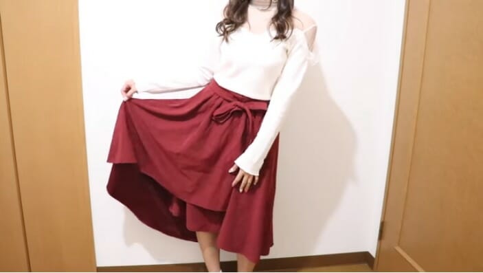 クリスマスのイメージの「赤」を白と合わせたコーディネートだ。紹介の際にはこのコーデに暖かいアウターを着用しているのでそちらも動画でチェックしてほしい。