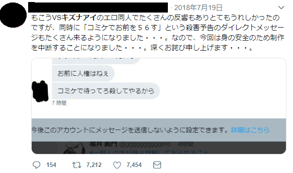 その後批判的な意見は更に発展し、同人作家に○害予告が送られる事態にまで発展。