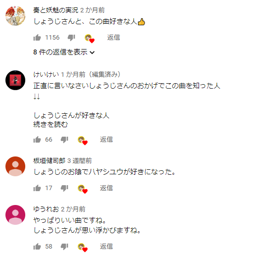 そのため、2019年3月にリニューアルした動画が投稿されるもまだまだコメント欄には「しょうじから」のメッセージで溢れかえっている。また、上のコメントにもある通りしょうじの動画がきっかけでハヤシユウファンになったという視聴者も多いようだ。