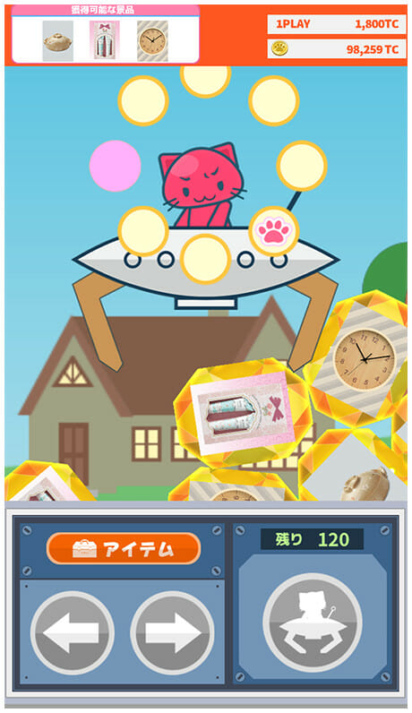 このように2Dタイプのゲーム画面で右・左のボタン操作のみで実際のクレーンゲームよりも比較的簡単に操作ができる新感覚クレーンゲームアプリである。