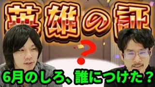 最初にしろが英雄の証を付けたいモンスターの候補として挙げたのは、アーサー、ルシファー、ツクヨミ、卑弥呼、神威、ノンノの6体。この中から1体選ぶことになった。しかし、ルシファー新春ルシファーの扱いを見たいとしろがコメント。さらに、ルシファーが獣神化しなかったら、新春ルシファーに英雄の証を付けたいと付け加えた。新春ルシファーの動向を見るためにも、今回ルシファーは無しとネタ晴らしをしたしろ。