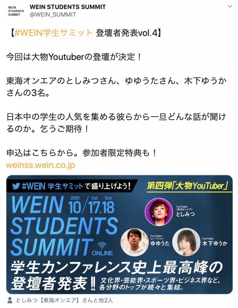 東海オンエア•としみつ,ゆゆうた,木下ゆうか #WEIN学生サミット に登壇決定