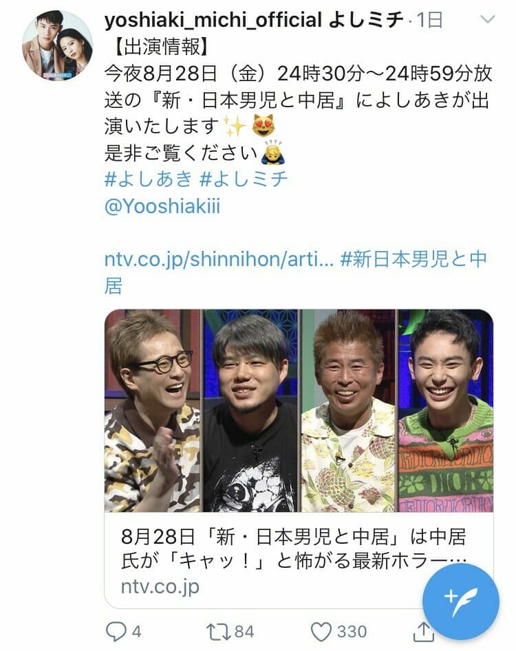 よしミチchのよしあき『新・日本男児と中居』に出演!