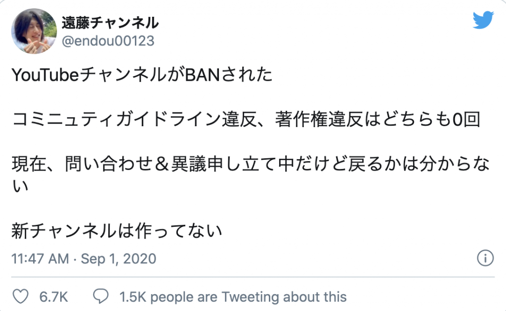遠藤チャンネル 突然YouTubeチャンネルが垢BANに「異議申し立て中」