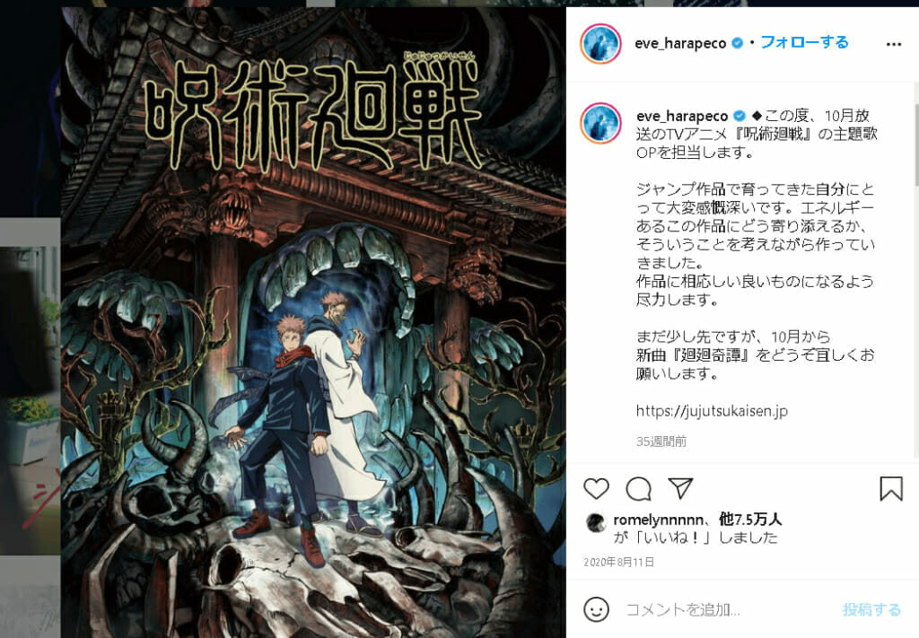 呪術廻戦OPのEve「廻廻奇譚」が1億回再生突破!