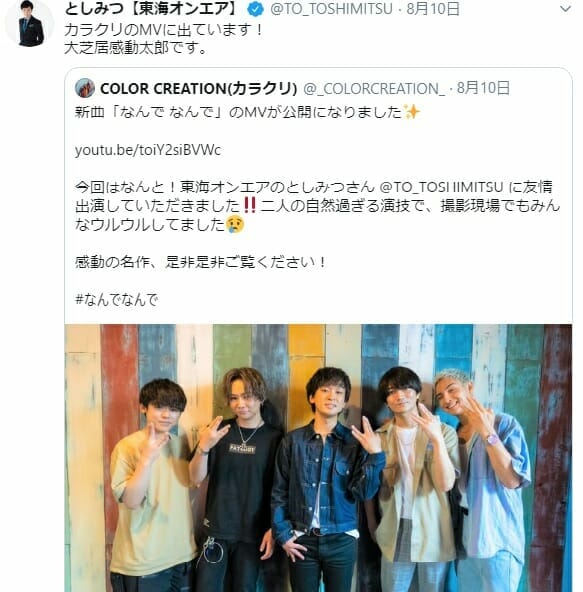 東海オンエア としみつ カラクリの新曲MVに彼氏役で出演