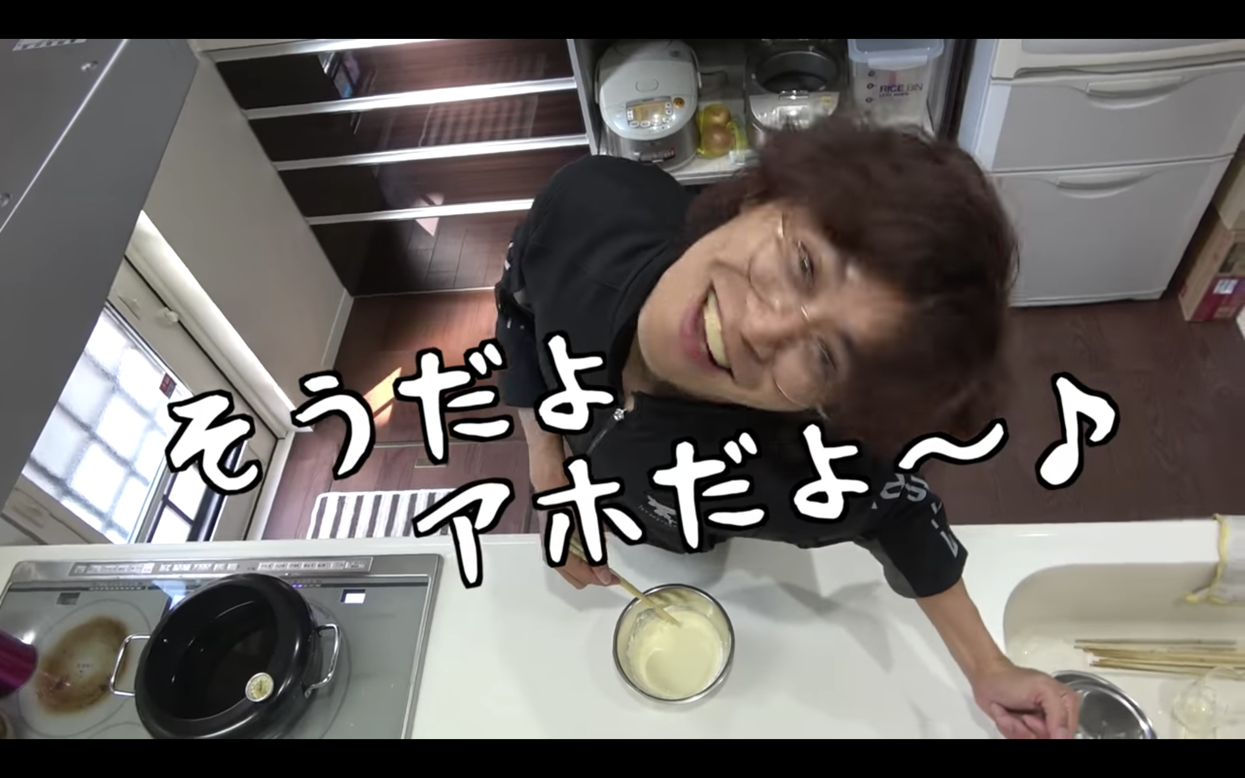 むねおとよーらいは、雪見だいふくでアイスの天ぷらを作って食べるという動画を公開したが、カメラを回してるよーらいは、カメラを高いアングルから撮り出すと、むねおはノリノリでパークマンサーの「そーだよアホだよー」をやってみせたww