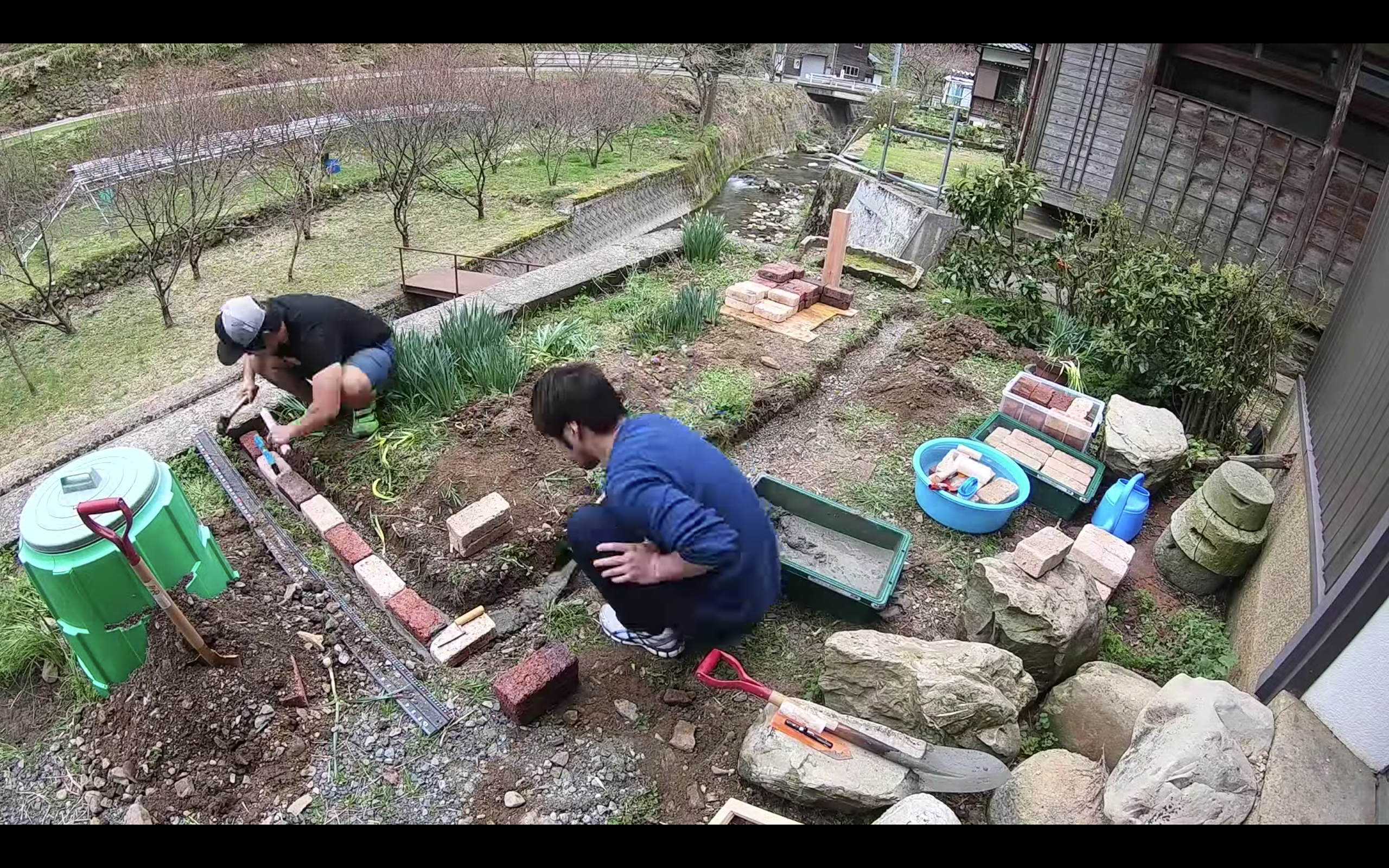 カズは弟と共に、古民家の庭にレンガを敷き詰める作業を行なって、古民家企画を久しぶりに動画投稿した。