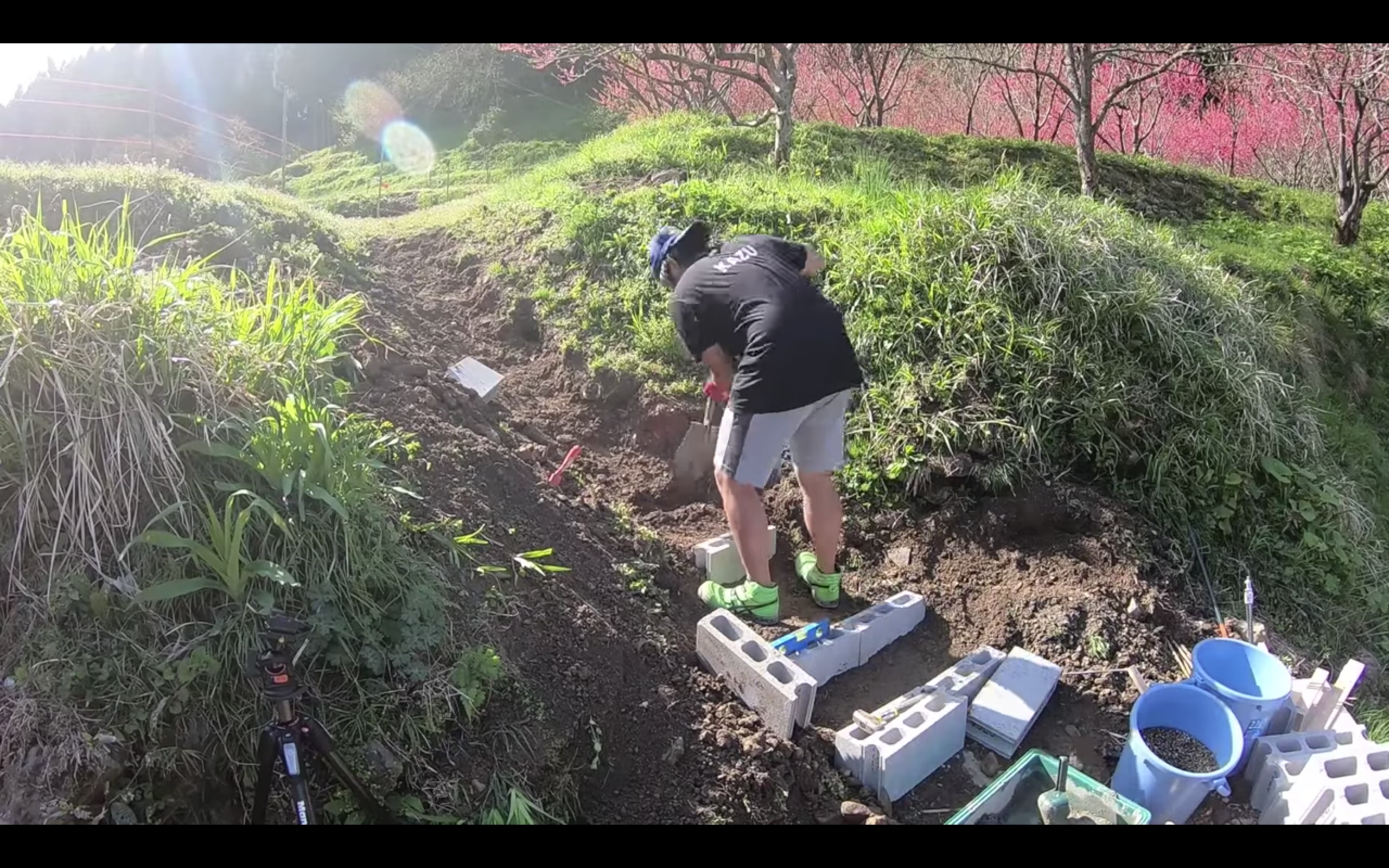 カズは古民家改造計画で、歩きづらい急斜面にコンクリブロックで階段を作る作業を行い、古民家改造を一歩前進させた。