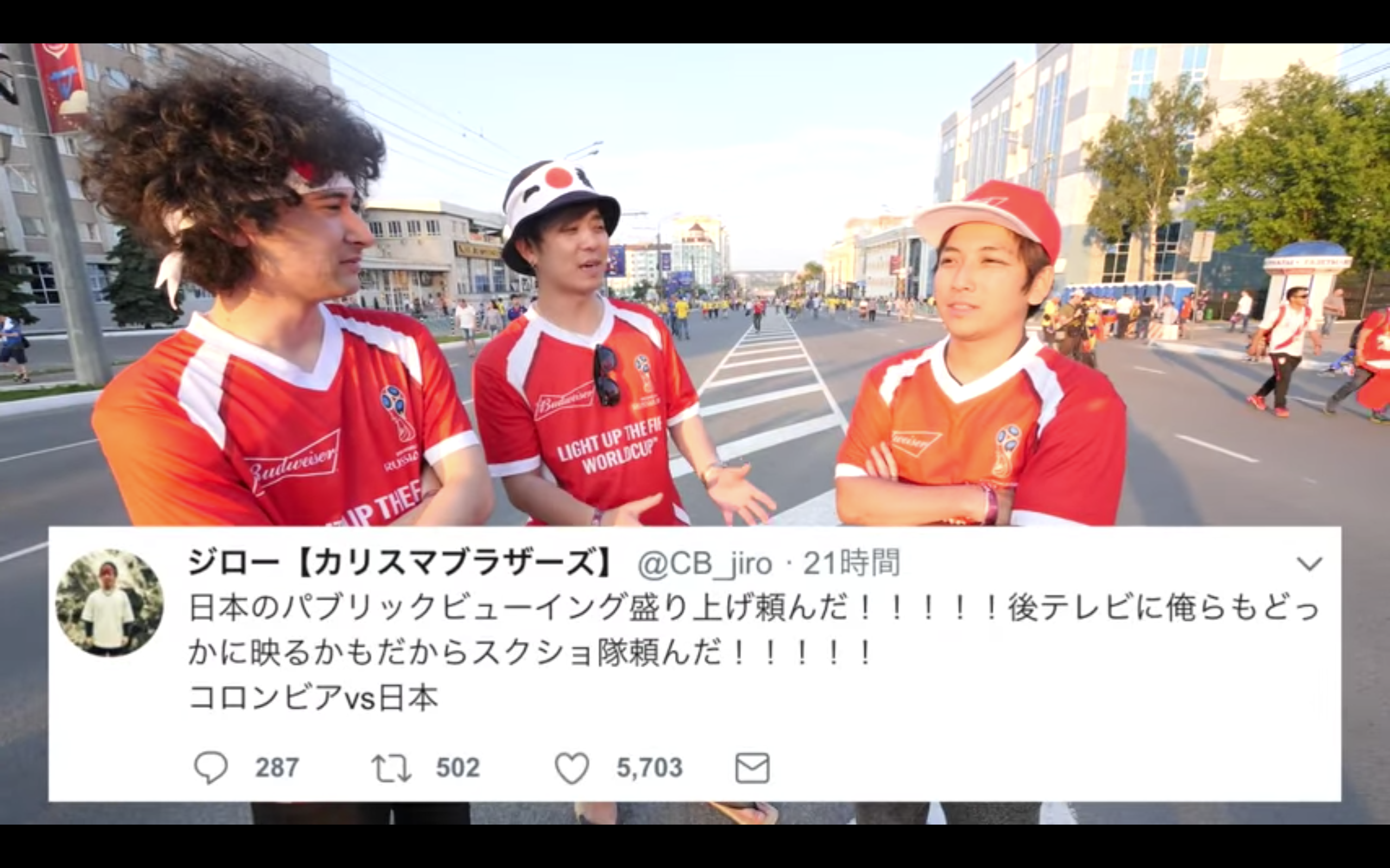 2018年6月20日、カリスマブラザーズは「日本対コロンビア戦にとある3人組YouTuberが映り込む!?【W杯】」を公開し、ロシアW杯で日本対コロンビアを観戦した直後のカリスマブラザーズだが、コメント欄には、中継に映し出されたカリスマブラザーズに対してのコメントが多数寄せられた。