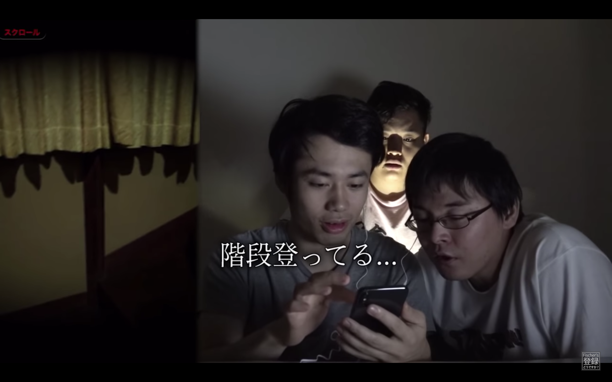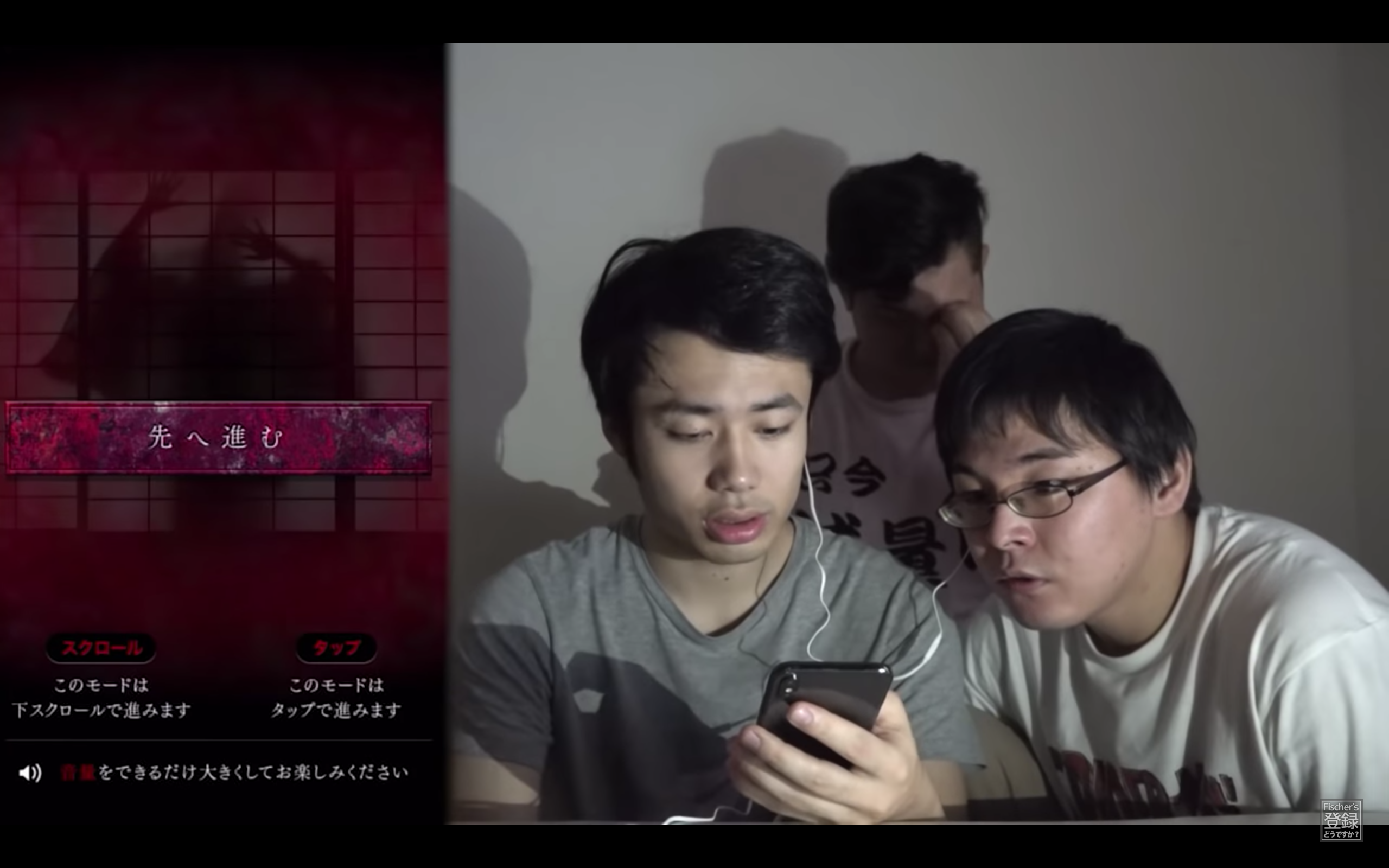 株式会社闇の「サクヤサマ」というホラーアプリを紹介するシルクロード、ダーマ、ンダホ。ホラー感を出すために、部屋の電気を消して進めていく。スクロールで先へ進め、サクヤサマが近づいてくると、目を隠さなければいけない。電気を消したことにより、ホラー感がアップし、驚きを隠せないメンバー。スクロールで先に進めていくと待ち受けているのは、どのような恐怖だろうか?