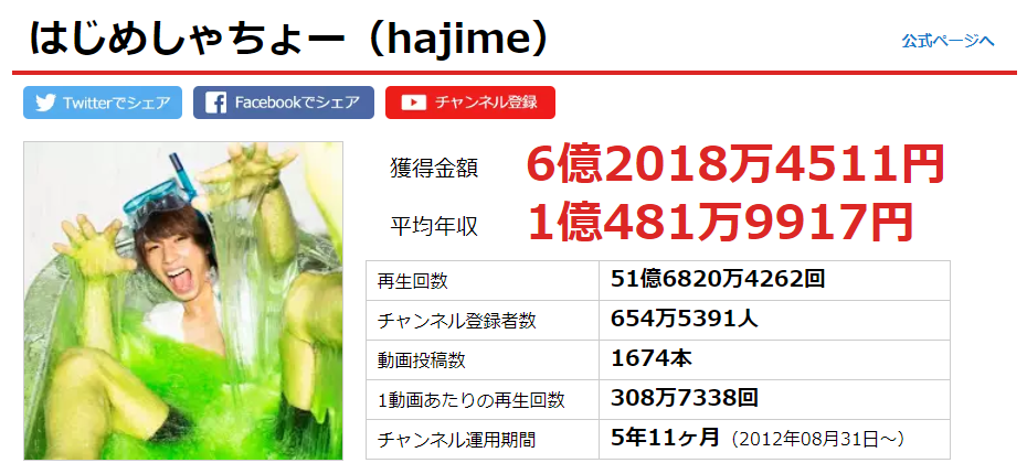 続いて、はじめしゃちょーのメインチャンネルの予想平均年収はこちら↓