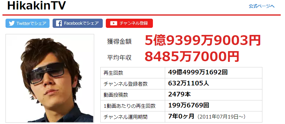 まずはヒカキンのメインチャンネルの予想平均年収はこちら↓
