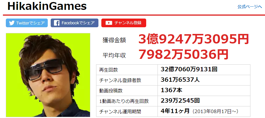 更に、ヒカキンは「Hikakin TV」だけでなくゲームチャンネルである「Hikakin Games」も大量の再生数を獲得している。