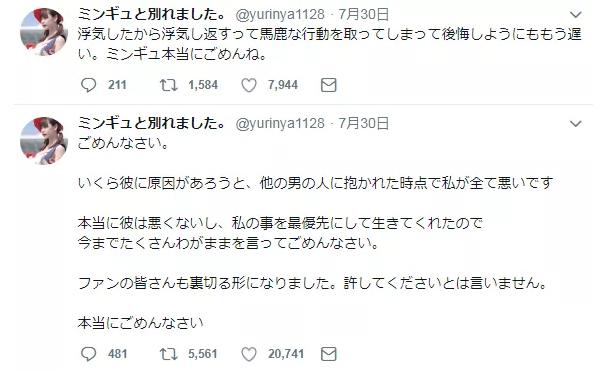 最後の復縁から2日後の8月8日、ファンたちの心配を他所にミンギュがゆりにゃとデートしていることをTwitterで報告した。