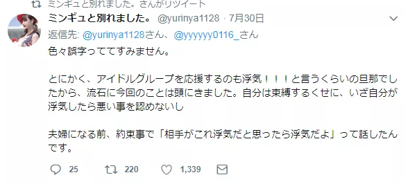 しかし、もともとふたりの間(と、言うよりもミンギュの独断)では、アイドルの応援など、とにかく「異性」とどんな形であれ関わると浮気とみなされるという束縛にも近いルールがあったため、ゆりにゃはミンギュの行動を「浮気をした」と判断し、激怒したのだという。