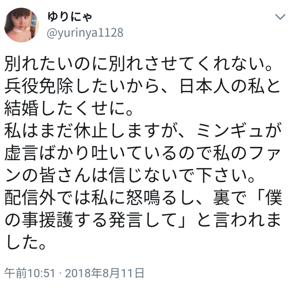 実は、もともとゆりにゃはミンギュと喧嘩をする度「ミンギュに脅迫されている」「DVを受けている」「本当は別れたい」など漏らしていることはあったのだ。