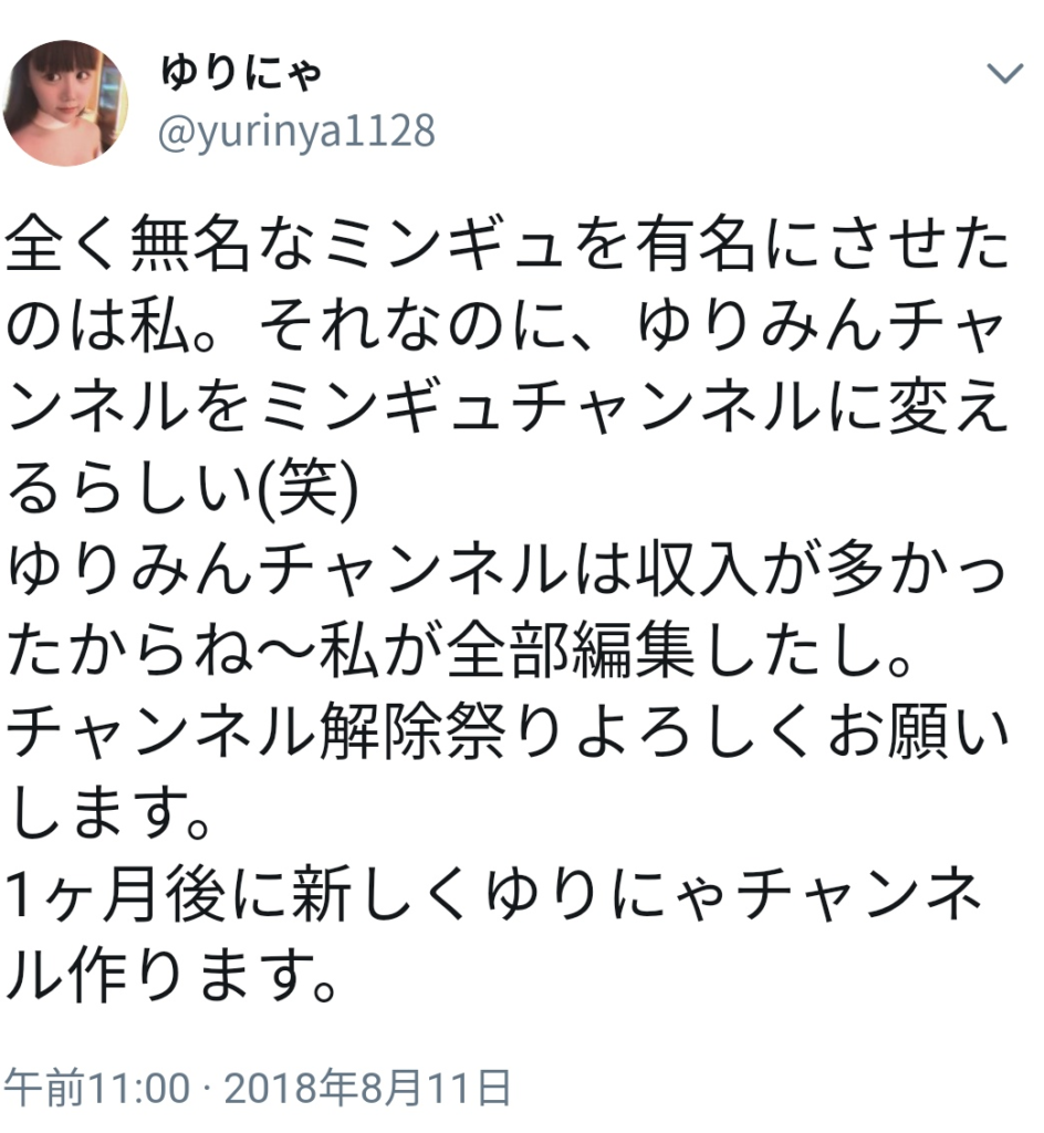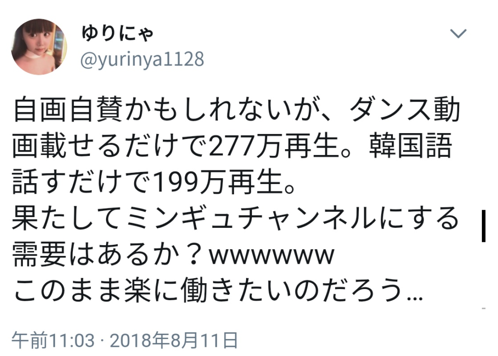 更に、これまでゆりみんチャンネルが人気でいられたのは自分のおかげ、そして今後ミンギュひとりでチャンネルを支えていくことはできないなどミンギュの「知名度」を貶す発言など、今までのゆりにゃからはあまり考えられない(?)ような発言も。