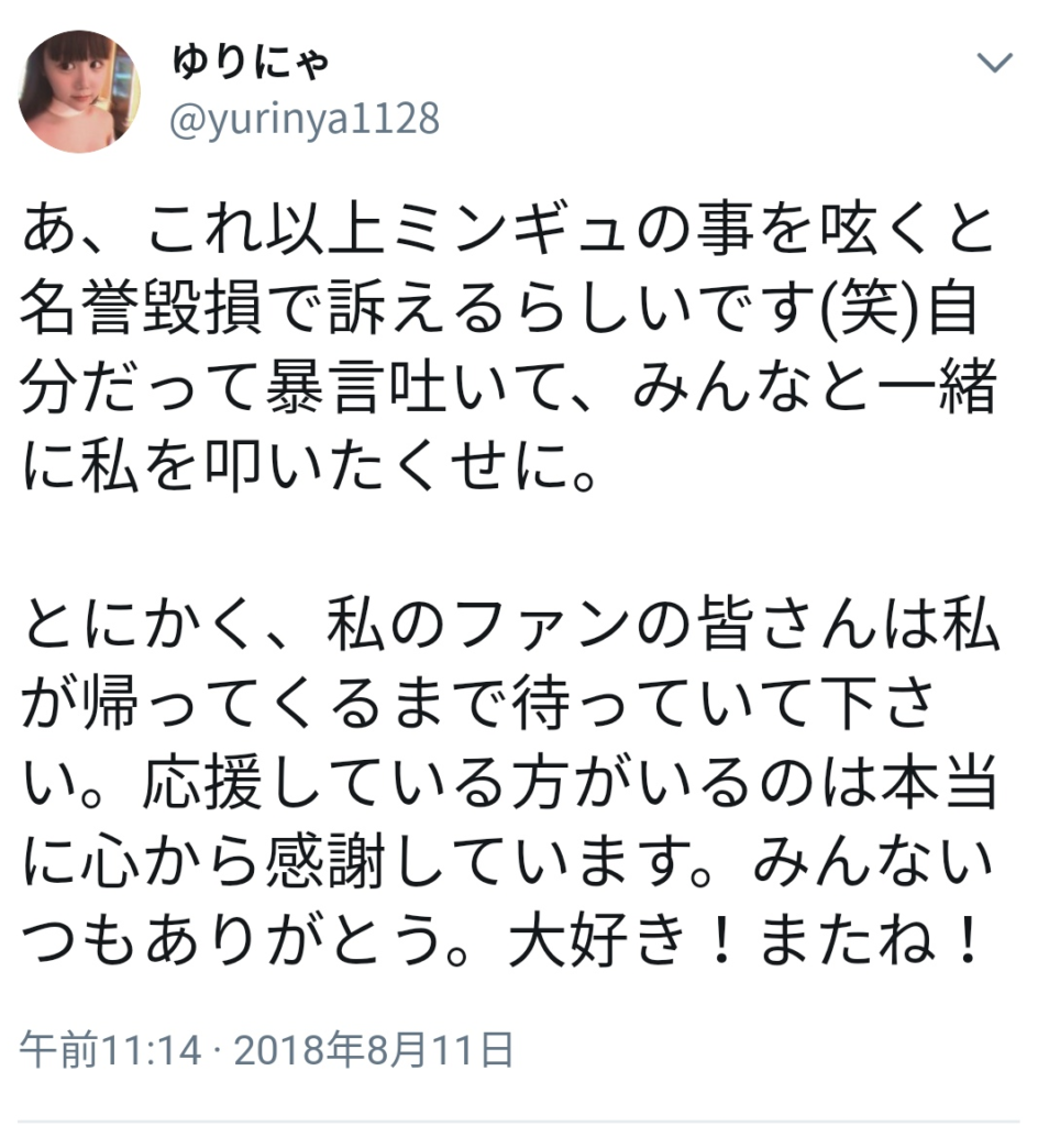 ゆりにゃに連絡を取り、これ以上ミンギュについての話題を挙げると名誉毀損で訴える、とゆりにゃを脅したようだ。