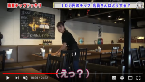 テーブルの上に大金のチップを置いて店を出たら店員さんはどんな行動をとるのか?その様子をモニタリングする企画だ。