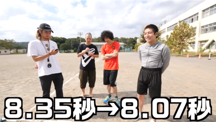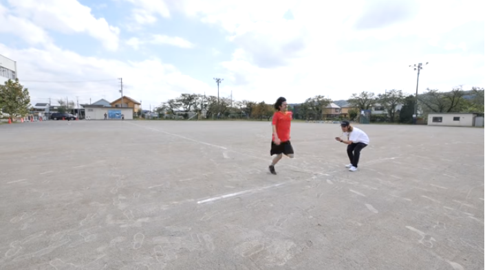 みのとジョージは瞬足を履いて検証、そしてカリブラの中で意外と足の速いジローは、瞬足の検証ではなく「裸足のほうが速い説」を検証するため、靴を履いた状態と裸足の状態で計測することに。