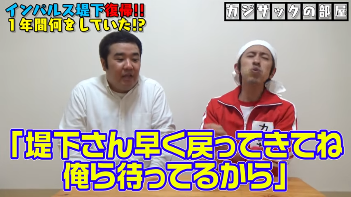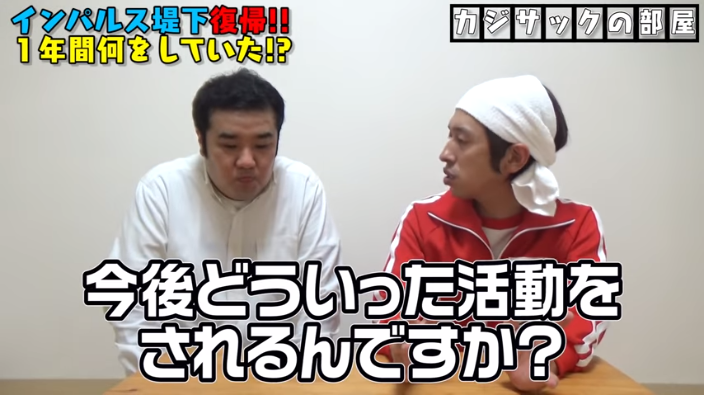 2018/10/24にカジサックのチャンネルで公開された「復活・インパルス堤下が独占激白」という動画で、昨年から芸能活動を休止していたお笑い芸人インパルスの堤下敦が、芸能活動復帰を記念してカジサックのチャンネルに登場した。