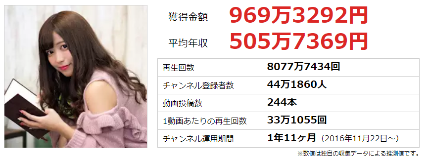 現在、ゆんちゃんねる単独での彼女の予想年収は約500万円ほどだと言われている。