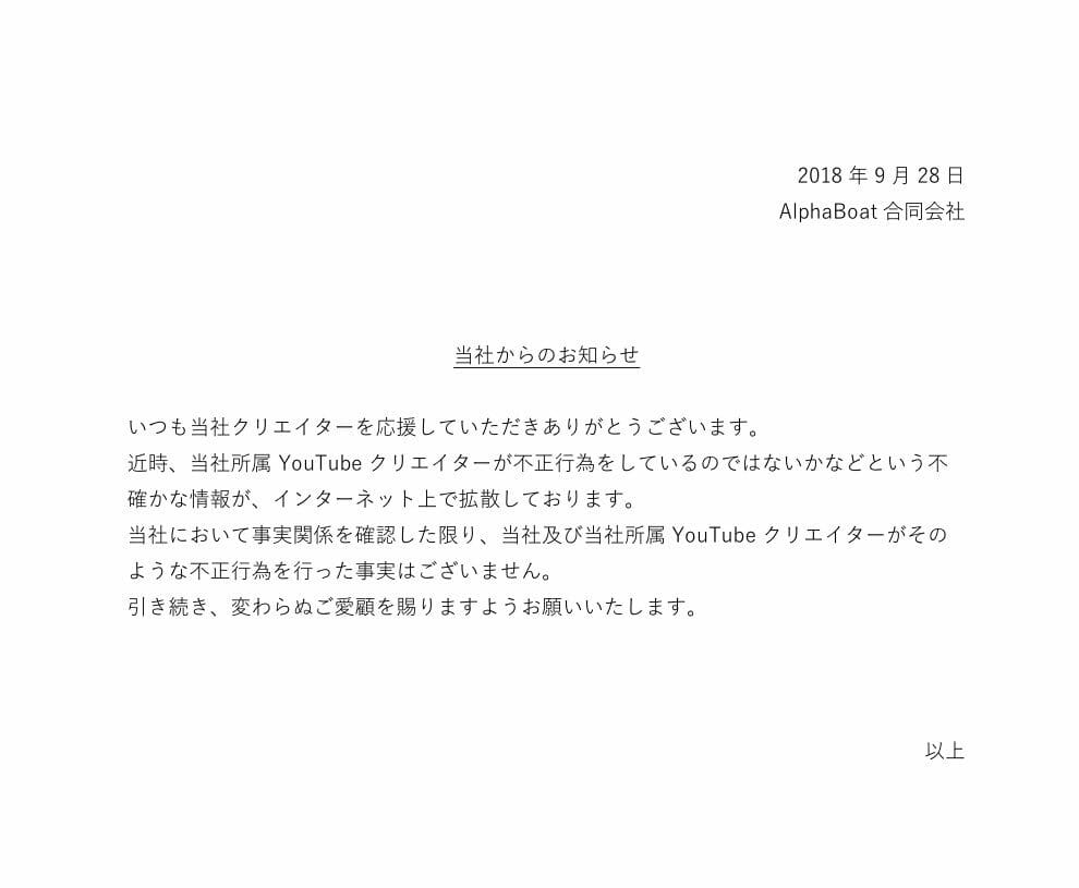 これについて所属事務所であるAlphaBoatは、正式に「不正はなかった」ということを表明している。