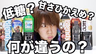 はじめしゃちょーは、コーヒー飲料には「微糖」「低糖」「甘さ控えめ」「カロリーオフ」など様々な表現があり、実際味はどう違うのかよくわからないと感じている。そこで、各種の表記のコーヒー飲料を飲み比べて、甘さ順に整理してみた。