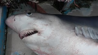 変な魚おじさんから、巨大な魚が入ったので包丁を持って来い、と呼び出されたかねこ。実際に見に行くと、なんと200キロもありそうな巨大なヨシキリザメがそこにいた!