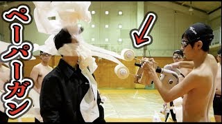 気温7度の体育館。トイレットペーパーガンを持ったスナイパー達はなぜか海パンにゴーグル姿だ。