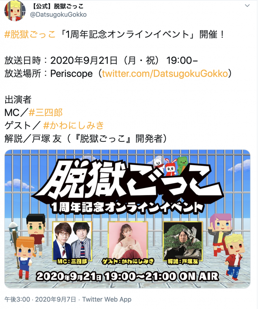 かわにしみき アプリ「脱獄ごっこ」の1周年記念オンラインイベントに出演! MCは三四郎
