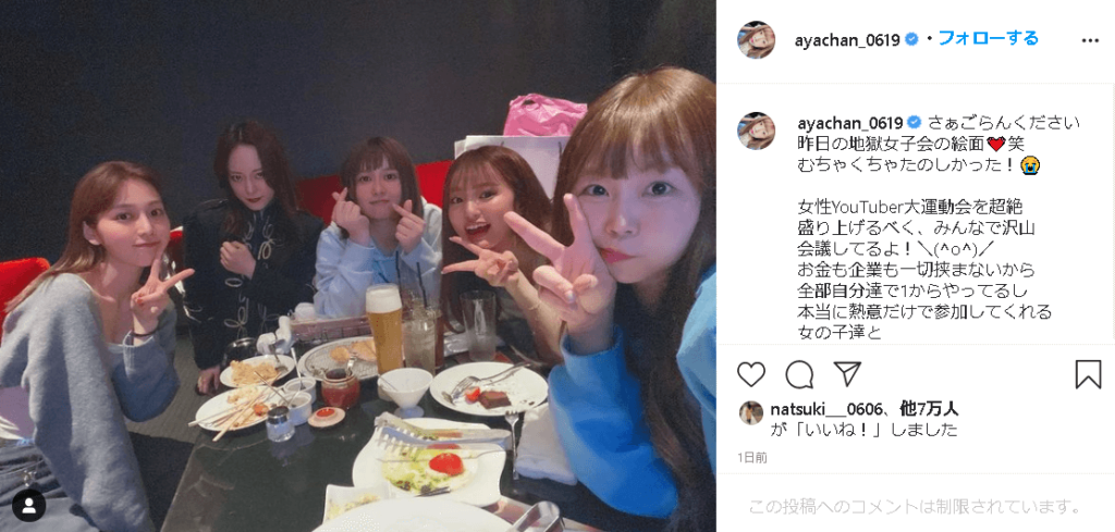 あやなん 古川優香やエミリン等とマスクなし女子会を開催し炎上